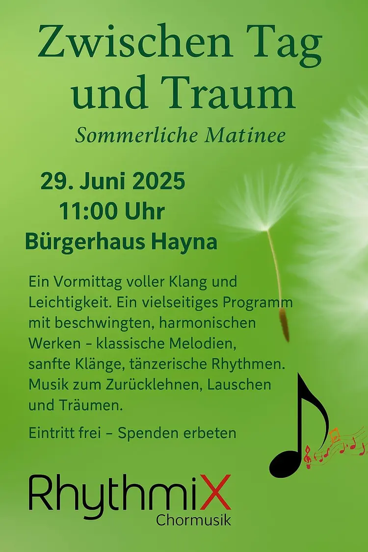 Unsere Matinee ist in Vorbereitung. Am 29.06.25 11:00 Uhr im Bürgerhaus in Hayna findet unsere Matinee statt Jeden Montag wird an den Liedern gefeilt. Das Thema " Zwischen Tag und Traum " verspricht eine kleine Auszeit zu werden. Kommen Sie mit uns auf die Reise. Genießen Sie mit uns das "Hier und Jetzt"!